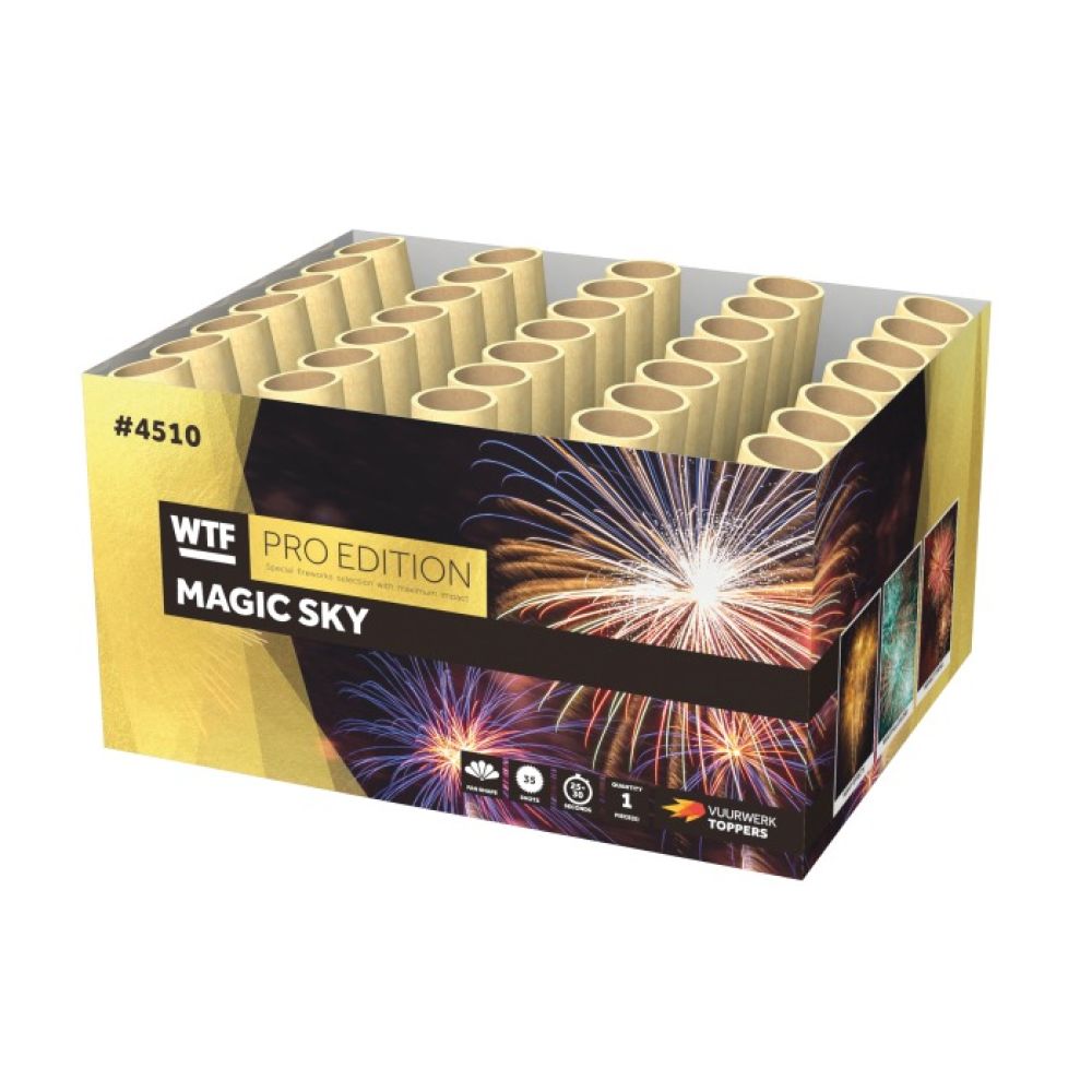 Wat een kraker, de Magic Sky! Deze 35 schots, 500 GRAMS cake schiet in waaiervorm zijn effecten de lucht in, voor een extra groot en breed effect. Volop crackling chrysanthemum effecten, mijnen, grote boeketten en rode sterren.