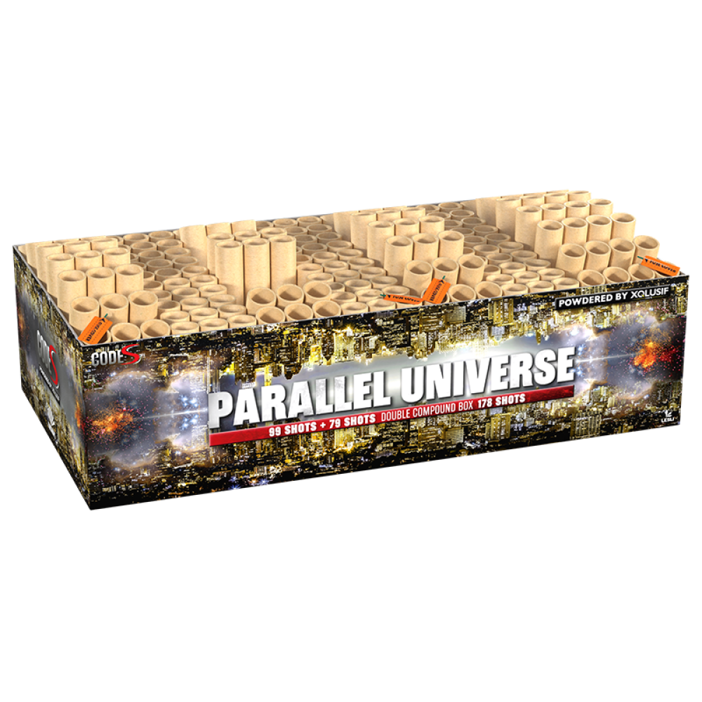 Deze dubbele compound brengt je naar een Parallel Universum. Met deze dikke bak koop je een complete vuurwerkshow met verschillende schietrichtingen, zoals I-shape, fanshape en W-shape. Mooie heldere coloured mines maken deze show compleet en de dubbele salvo finale is waanzinnig. Check de video!