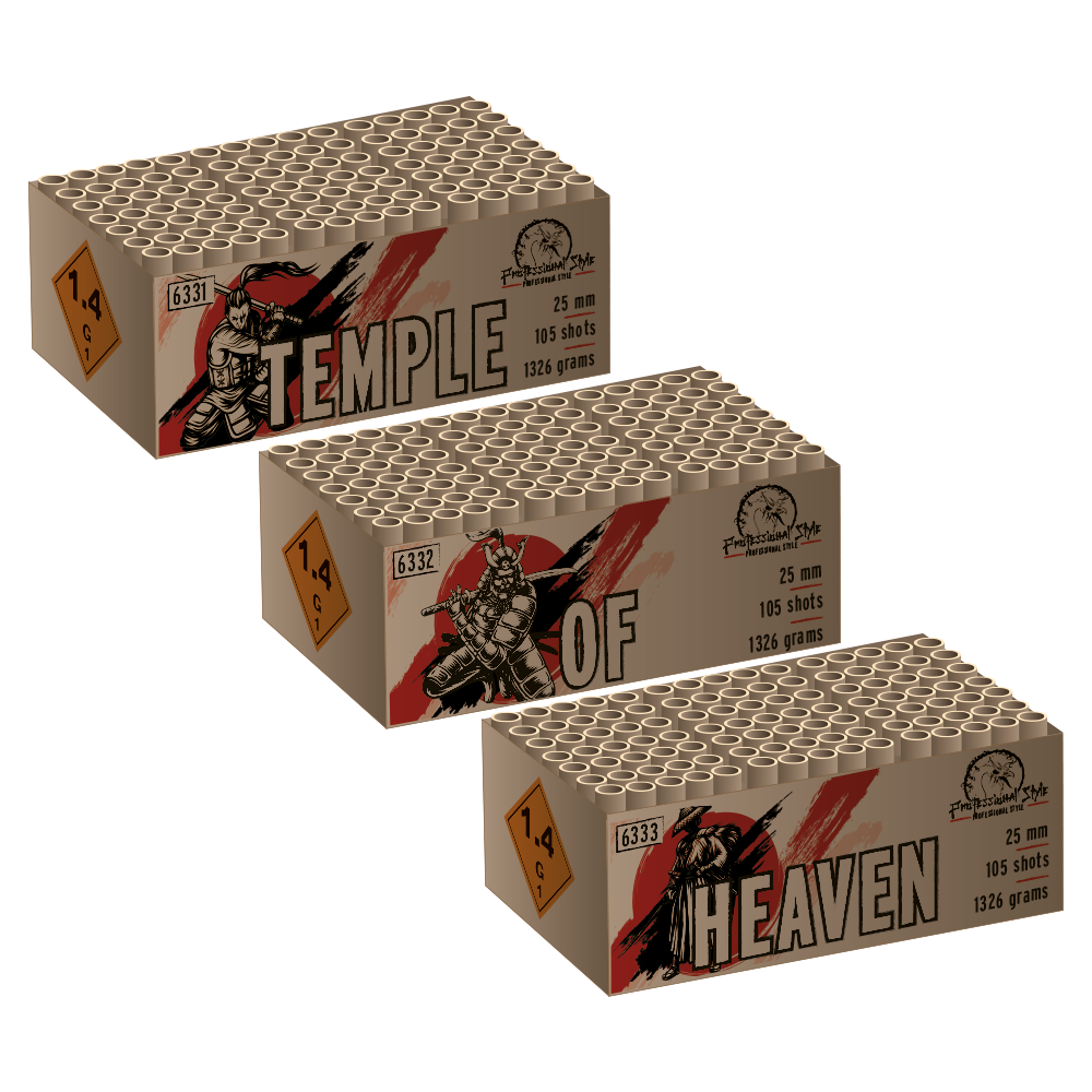 Ben jij op zoek naar een hemelse set siervuurwerk om de hemel voor langere periode om te toveren tot jouw tempel? Dan is dit jouw set. De Temple of Heaven is een set van drie compounds met ieder 105 schoten 25mm tubes. In totaal komt deze vuurwerkshow daarmee op 315 schoten. Dit hemels genieten!